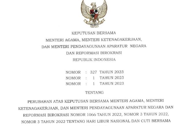 Beritakampus.id – Jakarta, Pemerintah telah menyepakati dan menetapkan perubahan hari libur nasional dan cuti bersama tahun 2023. Kesepakatan tersebut tertuang dalam Surat Keputusan Bersama (SKB) Menteri Agama (Menag), Menteri Ketenagakerjaan (Menaker), Menteri Pendayagunaan Aparatur Negara dan Reformasi Birokrasi (Menteri PANRB) Nomor 327 Tahun 2023, Nomor 1 […]