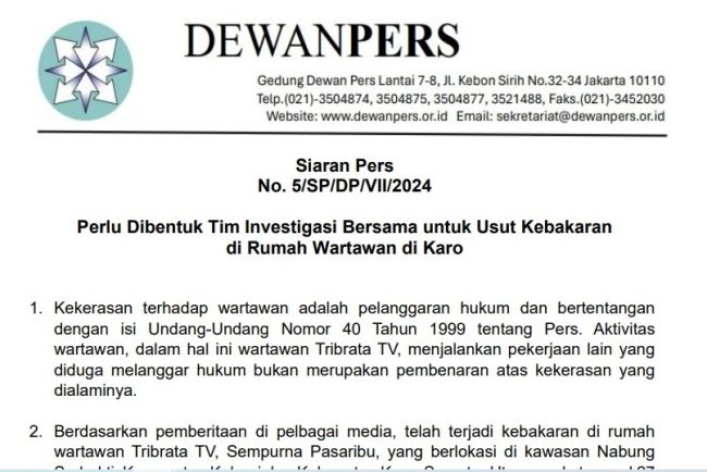 Beritakampus.id – Jakarta, 2 Juli 2024 Berdasarkan pemberitaan di pelbagai media, dimana telah terjadi kebakaran di rumah wartawan Tribrata TV, Sempurna Pasaribu yang berlokasi di kawasan Nabung Surbakti, Kecamatan Kabanjahe, Kabupaten Karo, Sumatra Utara pada tanggal 27 Juni 2024. Kebarakan itu menewaskan empat orang, yakni […]