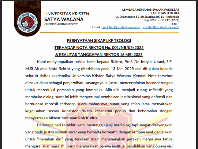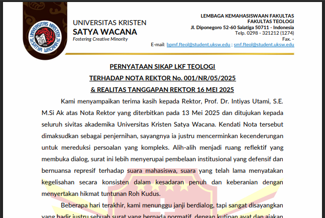 Beritakampus.id – Salatiga, 19 Mei 2025 – Lembaga Kemahasiswaan Fakultas Teologi (LKF Teologi) mengeluarkan pernyataan sikap resmi pada Minggu, 18 Mei 2025. Pernyataan ini merespons Nota Rektor No. 001/NR/05/2025 tertanggal 13 Mei 2025 dan apa yang disebut sebagai “Realitas Tanggapan Rektor 16 Mei 2025”. LKF […]
