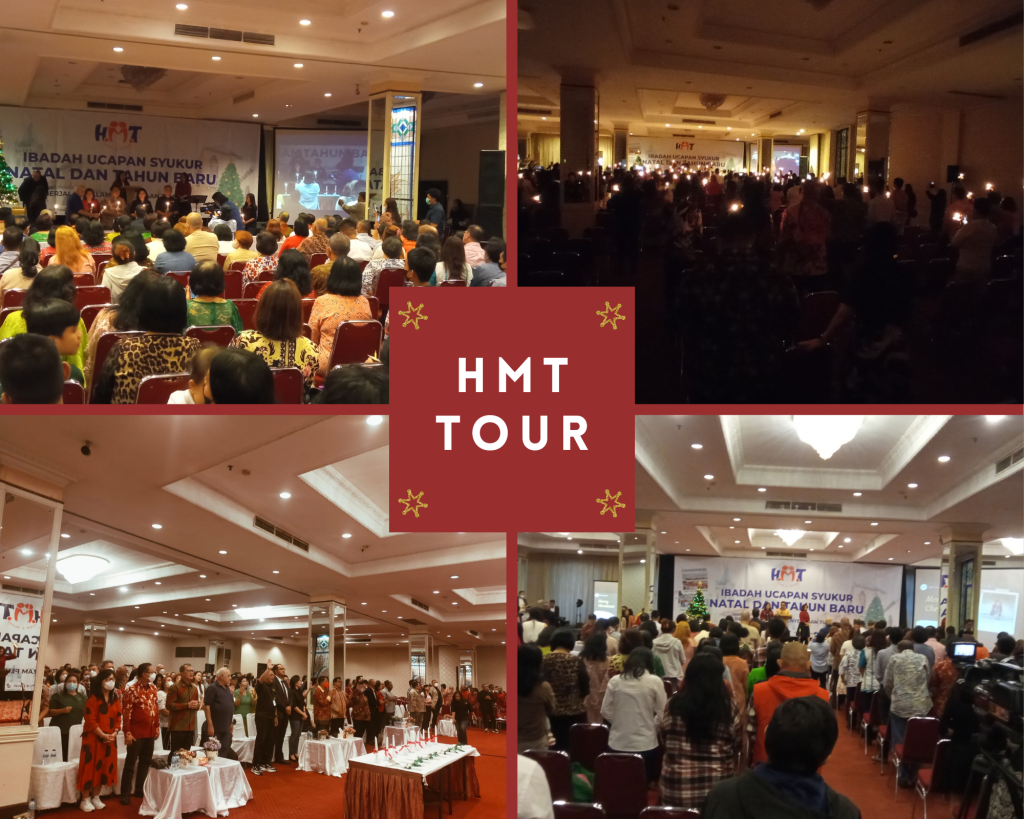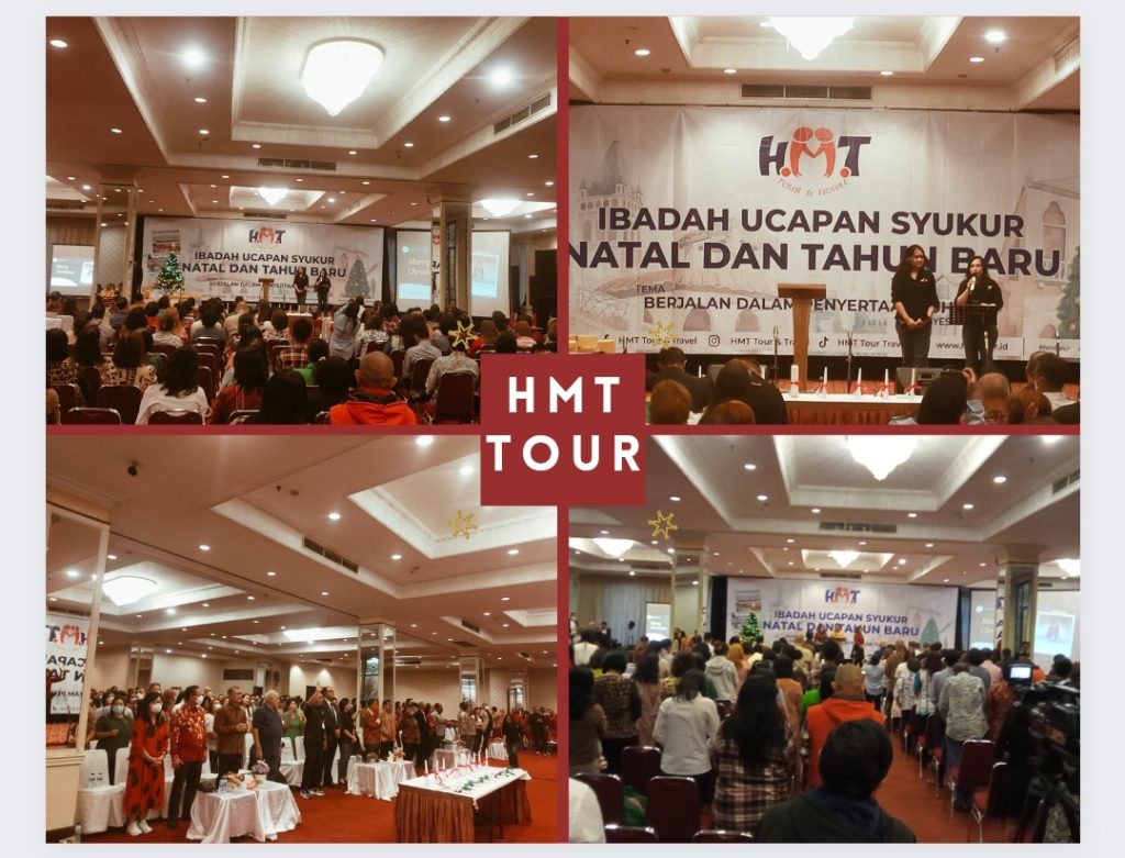 Ibadah Ucapan Syukur Natal dan Tahun Baru HMT Tour & Travel dimulai dengan opening oleh Pdt. John Leihitu dilanjutkan dengan penayangan video Opening HMT oleh Sandi Pairin, lalu kata sambutan Natal oleh Panitia Natal yaitu Leidy dan Abel dan doa pembukaan oleh Pdt. Sandy Suharsa.
