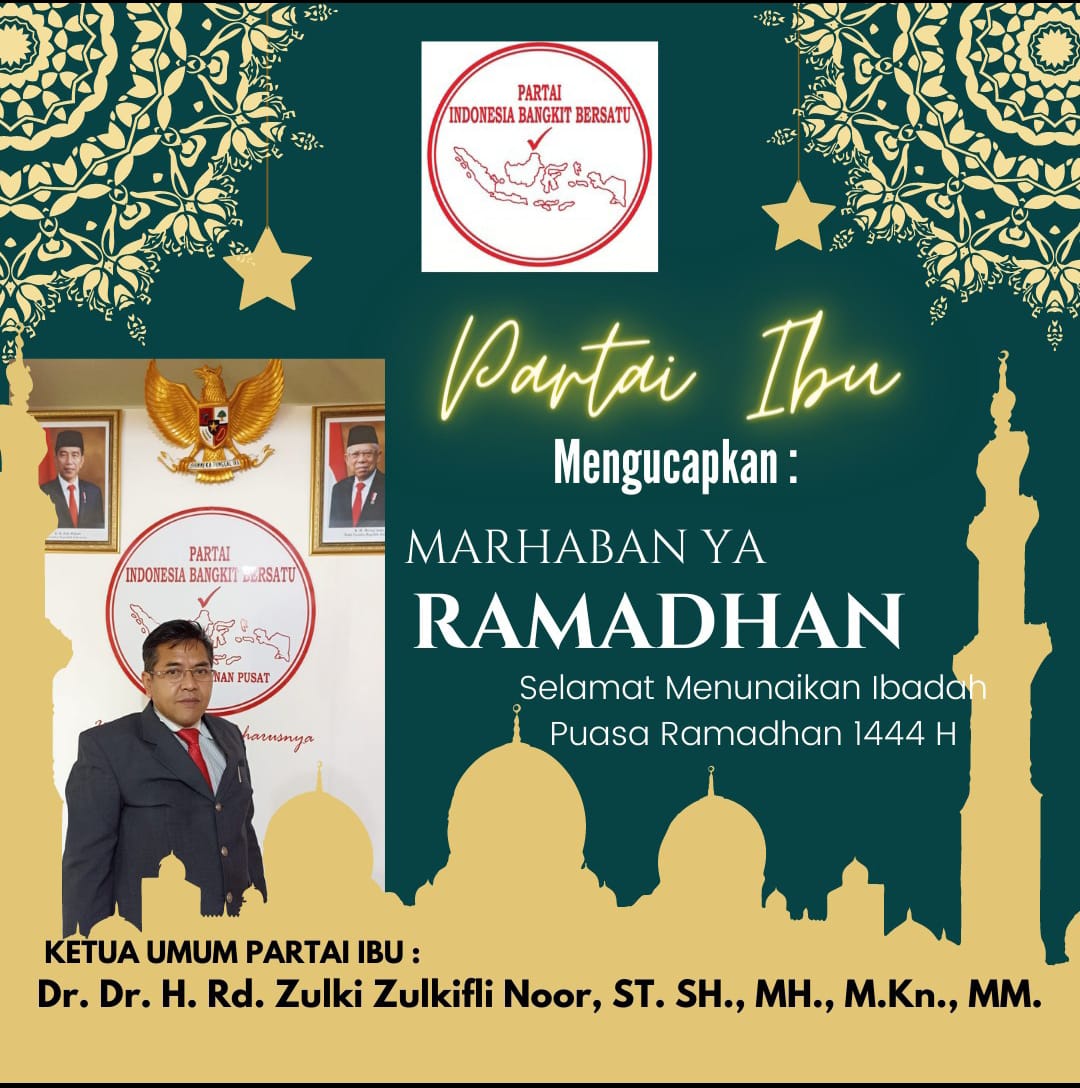 Saya Ketua Umum Partai Indonesia Bangkit Bersatu (PARTAI IBU) Dr. Dr. Zulki Zulkifli Noor, ST., ,SH., MH., M.Kn. MM. dan Segenap Pengurus Dewan Pimpinan Pusat, Dewan Pimpinan Daerah, Dewan Pimpinan Cabang dan Dewan Pimpinan Anak Cabang Nasional Mengucapkan, ” Marhaban Ya Ramadhan Selamat Menyambut Bulan Suci Ramadhan 1444 Hijriah.Minal Aidin Walfaizin Mohon Maaf Lahir dan Batin.