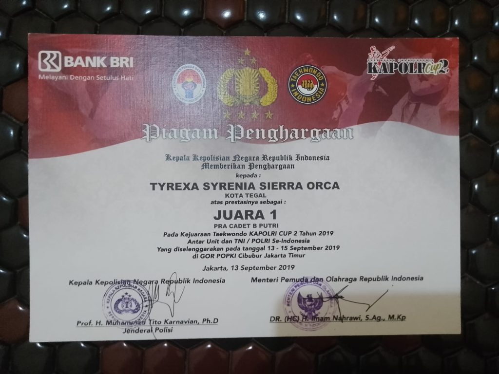 Sebelum itu, Tyrexa Syrenia Sierra Orca yang masih duduk di kelas 6 SD, dalam Pekan Olah Raga Pelajar Daerah (POPDA) berhasil menyabet juara 3 Taekwondo SD atlet putri under 37 kg Tingkat Karesidenan Pekalongan, yang dilaksanakan di Brebes pada tanggal 18 Pebruari 2019.