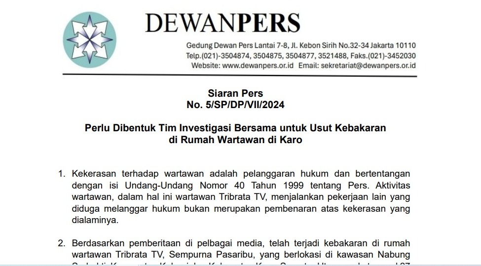 Ketua Dewan Pers Dr. Ninik Rahayu, S.H.,M.S. secara resmi mengeluarkan Siaran Pers No. 5/SP/DP/VII/2024 tentang Perlunya Dibentuk Tim Investigasi Bersama untuk Usut Kebakaran di Rumah Wartawan di Karo, sebagai berikut :