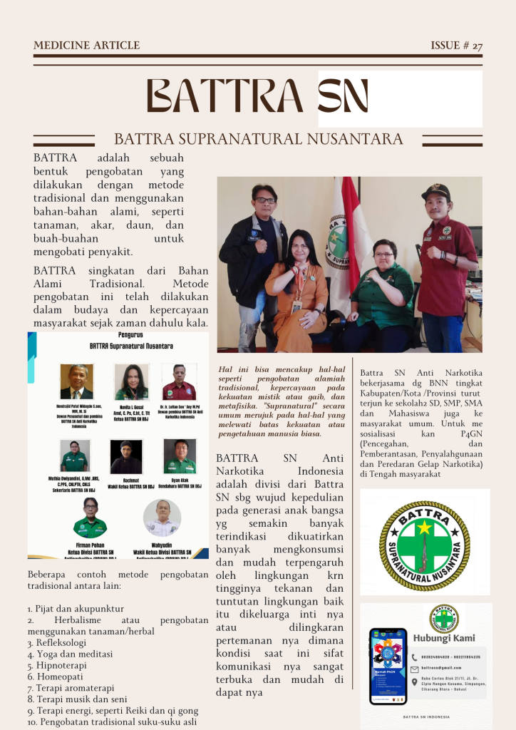 Beritakampus.id – Jakarta, BATTRA adalah sebuah bentuk pengobatan yang dilakukan dengan metode tradisional dan menggunakan bahan-bahan alami, seperti tanaman, akar, daun, dan buah-buahan untuk mengobati penyakit.