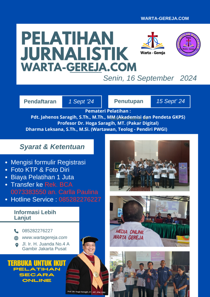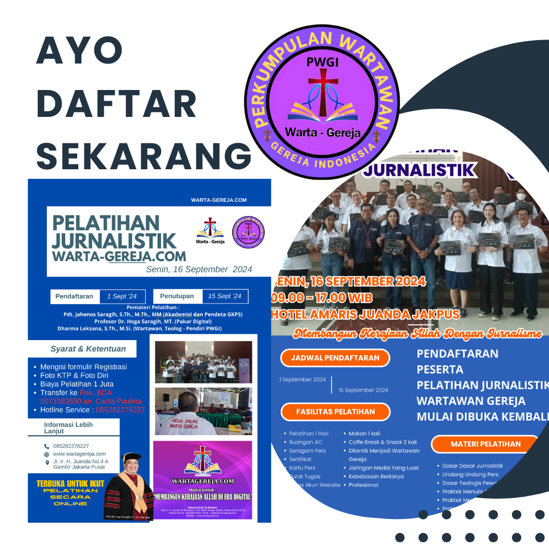 “Saya berharap, Para Pemuka Gereja, Organisasi Kristen dan Aktifis Kristen terpanggil bergabung Bersama kami. Dan dalam waktu dekat ini, hari Senin, 16 September 2024, Perkumpulan Wartawan Gereja Indonesia (PWGI) bersama Media Online Warta-gereja.com akan kembali menyelenggarakan PELATIHAN JURNALISTIK. Kami membuka kesempatan bagi warga gereja yang berminat menjadi WARTAWAN GEREJA dapat ambil bagian di dalamnya.” Pungkasnya.
