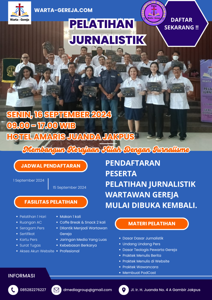 Beritakampus.id – Jakarta, Mengemban misi “Membangun Kerajaan Allah Dengan Jurnalisme di Era Digital”, Perkumpulan Wartawan Gereja Indonesia (PWGI) bersama Media Warta-gereja.com kembali menyelenggarakan PELATIHAN JURNALISTIK yang akan digelar pada Hari Senin, 16 September 2024 di Gedung Gereja GPIB PNIEL JAKARTA Jalan H. Samanhudi No.12 RT.03/RW.05, RT.3/RW.3, Ps. Baru, Kecamatan Sawah Besar, Kota Jakarta Pusat.