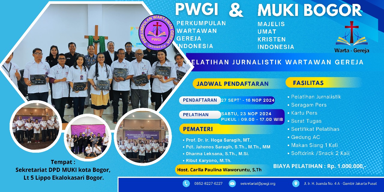 Beritakampus.id – Bogor, Dewan Pimpinan Pusat Perkumpulan Wartawan Gereja Indonesia (PWGI) Bersama Majelis Umat Kristen Indonesia (MUKI) DPD Kota Bogor akan gelar Pelatihan Jurnalistik Wartawan Gereja Pada Sabtu, 23 November 2024.