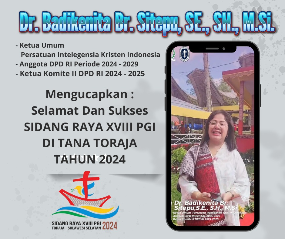 Beritakampus.id – Toraja, Dr. Badikenita Br. Sitepu, SE., SH., M.Si. Ketua Umum Persatuan Intelegensia Kristen Indonesia (PIKI), Anggota DPD RI Periode 2024 – 2029 dan sekaligus juga Ketua Komite II DPD RI 2024 – 2025 memberikan Ucapan Selamat dan Sukses Terselenggaranya Sidang Raya XVIII PGI Tahun 2024 di Toraja.