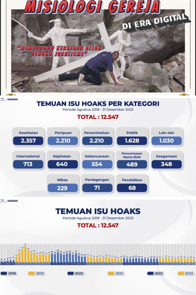At least 30-60% of Indonesians are exposed to hoax news when accessing and communicating via online media. According to data from the Ministry of Communication and Information, from August 2018 to June 30, 2023, 11,759 hoax issues were found, many of which were related to political, health, and religious issues. Unfortunately, only 21-36% of Indonesians are able to recognize hoax news.