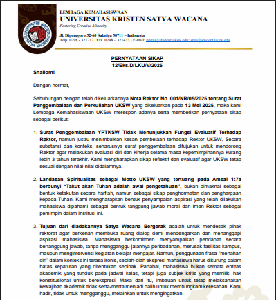 Beritakampus.id – Salatiga – Lembaga Kemahasiswaan (LK) Universitas Kristen Satya Wacana (UKSW) Salatiga merespons cepat Nota Rektor Nomor 001/NR/05/2025 tertanggal 13 Mei 2025 mengenai Surat Penggembalaan dan Perkuliahan UKSW. Dalam Surat Pernyataan Sikapnya, LK UKSW menilai Surat Penggembalaan Yayasan Perguruan Tinggi Kristen Satya Wacana (YPTKSW) […]