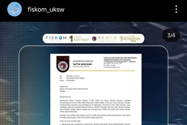 Beritakampus.id – Salatiga – Fakultas Ilmu Sosial dan Ilmu Komunikasi (FISKOM) Universitas Kristen Satya Wacana (UKSW) Salatiga menunjukkan sikap tegas terkait dinamika internal yang tengah terjadi di lingkungan universitas. Melalui surat pernyataan sikap resmi yang dikeluarkan, FISKOM menyerukan empati, kepedulian, dan mendesak pimpinan universitas untuk […]